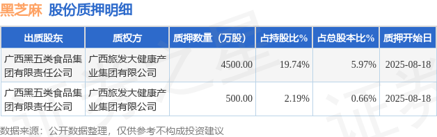 证券之星消息,黑芝麻(000716)8月20日公开信息显示,股东广西黑五类食品集团有限责任公司向广西旅发大健康产业集团有限公司合计质押5000.0万股,占总股本6.63%。质押详情见下表: