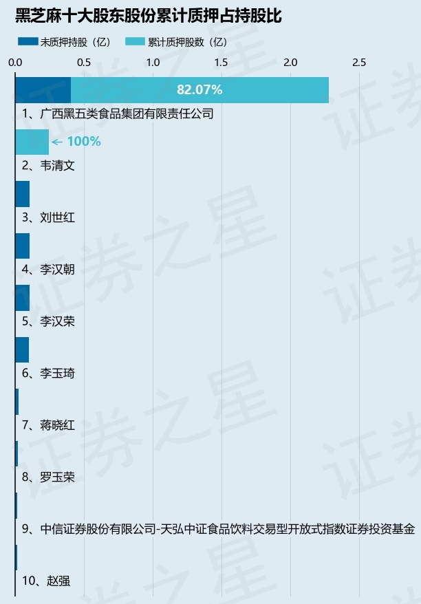 截止本公告日,股东广西黑五类食品集团有限责任公司已累计质押股份1.87亿股,占其持股总数的82.07%,股东韦清文已累计质押股份2482.34万股,占其持股总数的100.0%。本次质押后黑芝麻十大股东的累计质押股份占持股比例(占持股比例的计算以公司最新一期财务报表公布的十大股东的持股总数为基准)见下图:
